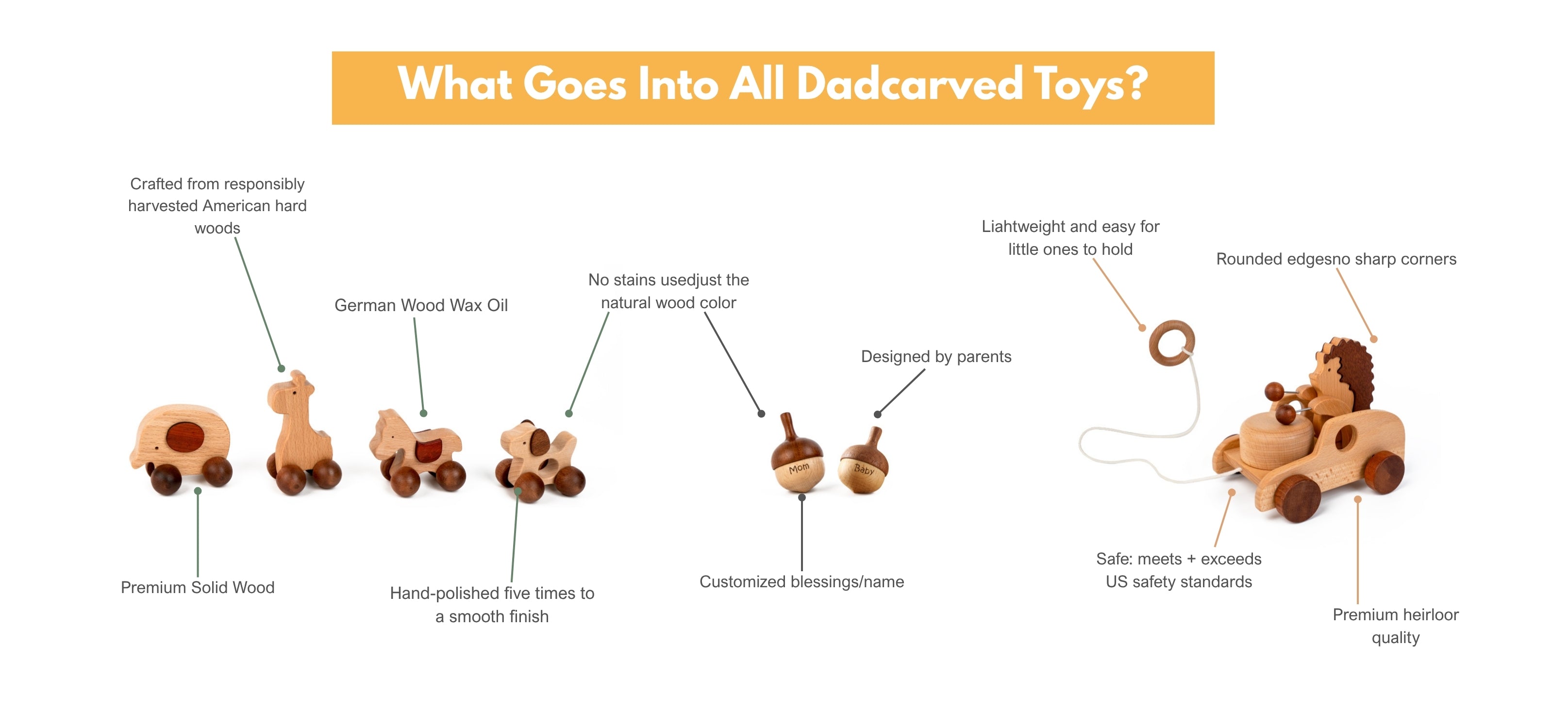 Yes, Dadcarved toys are an investment. This price reflects the premium hardwood, the continuous rejection of flawed material, and the countless hours of pure manual labor required to achieve our signature smooth finish. We are trading cheap, fast production for safety, longevity, and peace of mind.